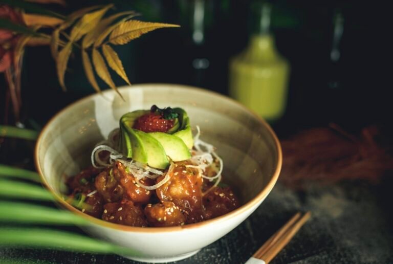 Bluefin tuna, avocado, homemade sauce, spring onions, spicy sauce, tempura, sesame.