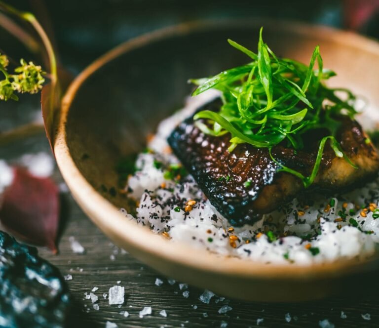 Degintas tunas, kepinti svogūnai, upėtakio ikrai, svogūnų laiškai, ponzu – trumų padažas.