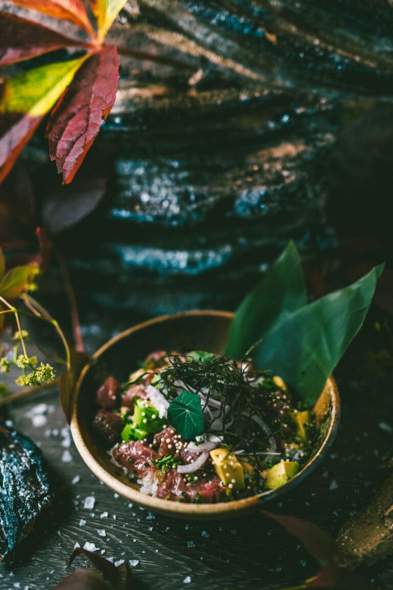 Mėlynpelekio tuno gabaliukai, svogūnų laiškai, pomidorai, avokadas, citrusinis padažas, bolivinė balanda.